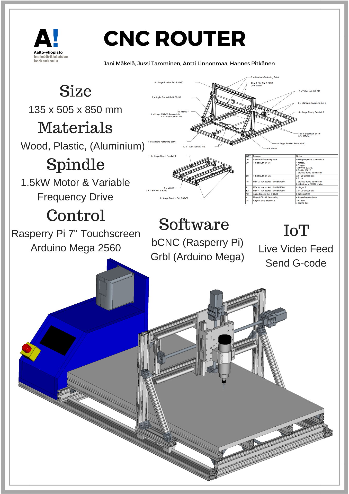 Then, during the summer we assembled and tested the CNC router. It's now located in mechanical engineering laboratory K3 basement where it can be used as well.